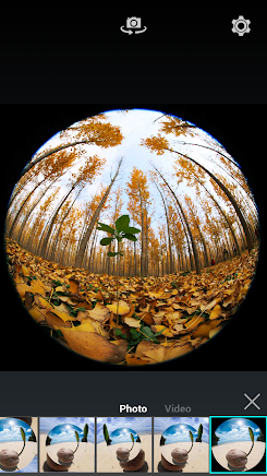 Aplikasi ini cukup menarik bagi saya, karena aplikasi ini bisa kita integrasikan dengan media sosial berbagi foto seperti Instagram. Aplikasi ini memiliki 4 macam lensa fisheye yang bisa kalian pilih dan juga terdapat pilihan background yang bisa kalian sesuaikan dengan foto yang akan kalian ambil.